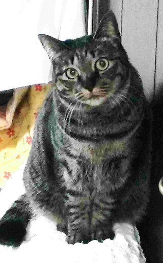 ギュウは、ベランダの猫小屋で生まれました。3日目に頭がはれていたので、保護しすぐ動物病院に連れていきました。しかし1つの目のすでにダメでした。小さな身体で大きな1つの目のギュウは、元気いっぱいで、一瀬家一の暴れん坊でした。姉妹の大柄でパンチ力の強いアニーと対等に戦えるのはギュウだけした。今頃は、いつも一緒に寄り添って寝ていたアニーと、天国でやっと逢えたことと思います。